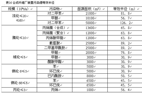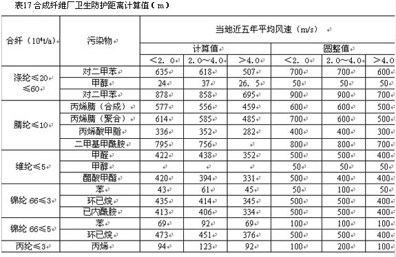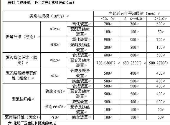 表17中不產(chǎn)生無組織排放污染物的生產(chǎn)裝置、如滌綸聚酯及紡絲、錦綸66縮聚及紡絲、丙綸紡絲等,其衛(wèi)生防護(hù)距離按滿足安全防火間距并留有充分余量的原則考慮,另外考慮到今后維綸不會有發(fā)展,因此上述幾種不列入正文表2.0.1中。