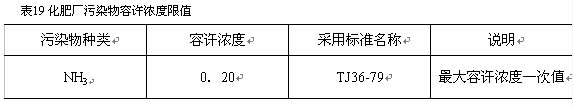 化肥企業(yè)一般排放多種大氣污染物,且無組織排放與有組織排放共存。為確定衛(wèi)生防護(hù)距離標(biāo)準(zhǔn),選定其中排毒系數(shù)最大,且對下風(fēng)向大氣環(huán)境影響最大的無組織排放物作為主要污染物,制訂本標(biāo)準(zhǔn)時確定以NH3作為特征污染物,因?yàn)樵谡Ia(chǎn)工況下,在氨泵房處的跑冒滴漏及罐呼吸會產(chǎn)生NH3的無組織排放。其最大容許濃度值見表19。