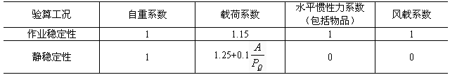 a. 起重機(jī)抗傾覆穩(wěn)定性的校核,應(yīng)按表4所列工況在最不利的載荷組合條件下進(jìn)行,包括起重機(jī)自重在內(nèi)的各項(xiàng)載荷對(duì)傾覆邊的力矩之和大于或等于零,則認(rèn)為起重機(jī)是穩(wěn)定的。計(jì)算時(shí)規(guī)定起穩(wěn)定作用的力矩符號(hào)為“正”,使起重機(jī)傾覆的力矩符號(hào)為“負(fù)”??紤]各種載荷對(duì)穩(wěn)定性的實(shí)際影響程度在進(jìn)行起重機(jī)抗傾覆穩(wěn)定性校核時(shí),各載荷力矩應(yīng)分別乘一個(gè)載荷系數(shù),如表4所示;