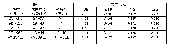 表1 鞋幫高度尺寸(h) mm