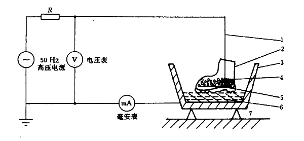 以工頻電壓施加于被試鞋內(nèi)、外電極,在規(guī)定的試驗(yàn)時(shí)間內(nèi),試驗(yàn)樣品如未擊穿,則毫安表指示的數(shù)值(mA)即為泄漏電流值,電壓表指示的數(shù)值(kV)即為耐電壓值。