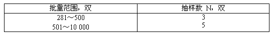 g) 型式檢驗(yàn)的樣品應(yīng)從合格的成品庫(kù)中進(jìn)行抽取,樣品數(shù)為3~5雙以滿足檢驗(yàn)項(xiàng)目要求為原則。