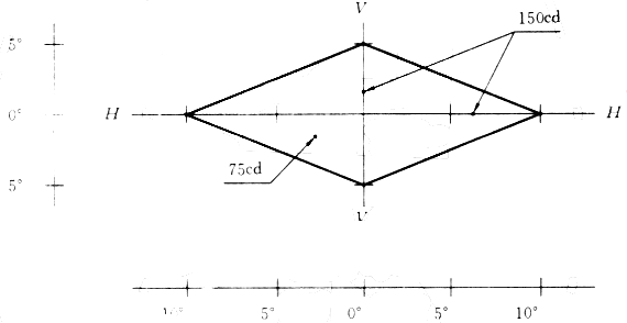 4.3.1.1 通過基準軸的水平H-H線和垂直V-V線上,在基準軸上、下5°和左、右10°之間(見圖1),其發(fā)光強度最小限值為150cd;