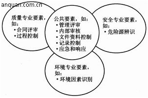 質(zhì)量管理、職業(yè)安全健康和環(huán)境管理三體系的立腳點(diǎn)都在于每一個(gè)工作過(guò)程之中。人們?cè)诿恳还ぷ鬟^(guò)程中都要考慮三個(gè)問(wèn)題,即:工作的要求和標(biāo)準(zhǔn)(質(zhì)量)、存在哪些危險(xiǎn)及如何避免(安全健康)、會(huì)產(chǎn)生哪些環(huán)境問(wèn)題及如何控制(環(huán)境)。ISO9001質(zhì)量管理體系標(biāo)準(zhǔn)建立的出發(fā)點(diǎn),就是先進(jìn)行“過(guò)程識(shí)別”,識(shí)別出產(chǎn)品從產(chǎn)生、形成和實(shí)現(xiàn)的全過(guò)程中要經(jīng)過(guò)哪些過(guò)程(工序或活動(dòng))以及這些過(guò)程之間的關(guān)系。這些過(guò)程(工序或活動(dòng))基本上涉及到企業(yè)的整個(gè)管理系統(tǒng)。因此,質(zhì)量管理、職業(yè)安全健康和環(huán)境管理三體系的整合宜以質(zhì)量管理體系的過(guò)程為主線。也就是說(shuō),在質(zhì)量管理體系的過(guò)程(活動(dòng))的基礎(chǔ)上,增加職業(yè)安全健康管理體系和環(huán)境管理體系的要素和要求。三個(gè)體系的過(guò)程或要素可劃分公共過(guò)程(要素)和專(zhuān)業(yè)過(guò)程(要素)兩大部分,它們之間的關(guān)系如圖1所示。