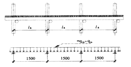 2.1.1 縱向水平桿的抗彎強(qiáng)度和撓度計(jì)算(按三跨連續(xù)梁,見圖1)