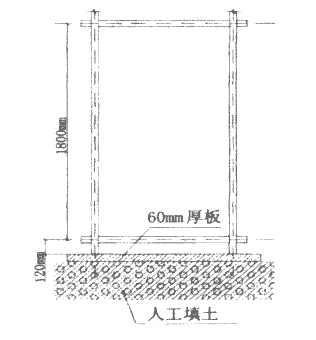1.7 本例腳手架立桿基礎(chǔ)采用壓實(shí)填土基礎(chǔ),填料為土夾石,碎石、卵石的含量在30%~50%,土分層回填平整夯實(shí)后的密實(shí)度為0.94~0.97,其承載力標(biāo)準(zhǔn)值取180kN/m2。然后采用長2.0m,寬200mm,厚60mm的木反作為墊木,將立桿布置在墊土的中心線上。(如圖4)