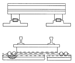 平交道裝置(見圖1),其功能是起方向轉換作用。該裝置分上下兩個結構層組成,下層裝有四個輪子,這四個輪子沿橋的垂直方向轉動,與鋪在橋面上的兩條滑道配合,使該裝置在卷揚機的牽引下能沿橋的垂直方向即橫向移動;上層沿橋的軸線方向固定兩根鐵道鋼軌,鋼軌軌距與水平高度和橋面上縱向鋪設的鋼軌軌距與水平高相等。