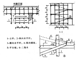 2.在平臺轉彎處縱向水平桿的上下方各設一根短橫向水平桿,用直角扣件分別固定在縱向水平桿及立桿上。鋪板通長鋪設,上端壓在縱向水平桿下邊的橫向水平桿上,下端壓在縱向水平桿上端的橫向水平桿上,鋪板中間在斜道與立桿交接處設二根橫向水平桿支承。鋪板探頭長度取150mm,端部與平臺板持平,夾縫用三角木順填,做法見節(jié)點大樣○A及部面圖。