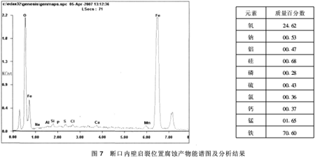 SEM檢查中發(fā)現(xiàn)內(nèi)壁附近斷口表面覆蓋有大量的腐蝕產(chǎn)物,如圖5、6所示。對(duì)斷口內(nèi)壁啟裂位置腐蝕產(chǎn)物表面的附著物成分進(jìn)行能譜分析,分析結(jié)果如圖7所示。