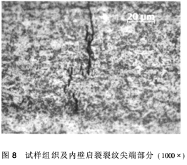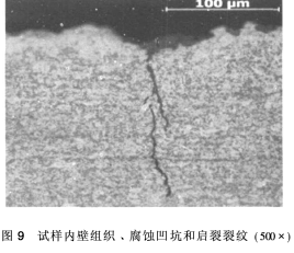 試樣取自氣瓶斷口處,在試樣距斷口約5m處內(nèi)壁觀察到一條較深的裂紋。該裂紋始于內(nèi)壁向外壁擴(kuò)展,且已經(jīng)超過壁厚的1/2。從裂紋尖端看,開裂以穿晶為主,伴有沿晶,如圖8所示。另外還觀察到由瓶底起至2/3高度的內(nèi)壁存在較多的腐蝕凹坑,并已出現(xiàn)一定數(shù)量源于凹坑的微裂紋,裂紋的擴(kuò)展也是以穿晶為主,伴有沿晶特征,如圖9所示。