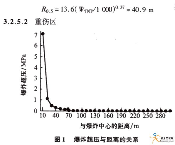 該區(qū)的人員如缺少防護(hù).則被認(rèn)為將無(wú)例外地蒙受?chē)?yán)重傷害,極少數(shù)人可能死亡或受輕傷。其內(nèi)徑為R0.5,外徑R1(m),△P為引起人員輕傷沖擊波峰值,其值為44