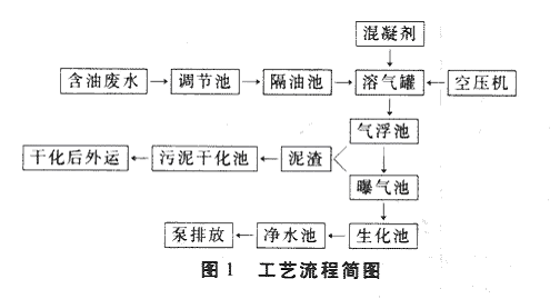 調(diào)節(jié)池和隔油池分離出來的油進入污油罐,加溫至50~60℃,靜置8h后脫水外賣或回用,將氣浮浮渣排到污泥干化場處理,干泥運走。工藝流程圖見圖1。