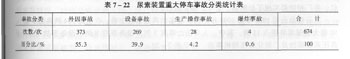 我國20世紀70年代引進的大型尿素裝置,在投產(chǎn)初期曾頻繁發(fā)生事故。從統(tǒng)計數(shù)字看,自1977年至1979的三年期間,投產(chǎn)的11套尿素裝置曾發(fā)生重大停車事故674次。其中,外部原因造成事故停車373次,占總事故次數(shù)的55.3%;設備事故停車269次,占總事故次數(shù)的39.9%。詳見表7—22。