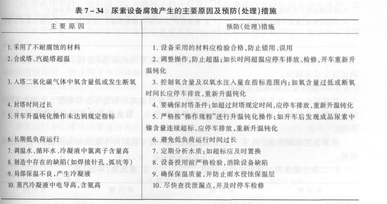 由于尿素裝置發(fā)生的設(shè)備腐蝕,特別是高壓設(shè)備發(fā)生的腐蝕,對設(shè)備的安全運(yùn)行危害極大。因此,必須對設(shè)備的防腐蝕工作有十分嚴(yán)格的規(guī)定。為此,各廠都制訂了“尿素裝置設(shè)備防腐蝕管理規(guī)定”。在生產(chǎn)運(yùn)行中,應(yīng)嚴(yán)格執(zhí)行防腐規(guī)定,避免發(fā)生設(shè)備腐蝕事故。尿素設(shè)備腐蝕產(chǎn)生的原因及預(yù)防,見表7—34。