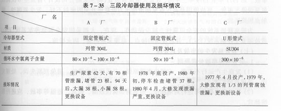 循環(huán)冷卻水對碳鋼水冷器及管道會產(chǎn)生腐蝕,腐蝕往往可造成水冷器泄漏。由于循環(huán)冷卻水中存在氯離子,氯離子對不銹鋼水冷器產(chǎn)生應(yīng)力腐蝕。尿素裝置冷換設(shè)備中,常見的腐蝕是二氧化碳壓縮機(jī)的段間冷卻器發(fā)生的應(yīng)力腐蝕,腐蝕造成管子裂紋。腐蝕事故往往造成停機(jī)堵管或停機(jī)更換段間冷卻器。其中,以三段冷卻器腐蝕尤為嚴(yán)重。裝置投產(chǎn)初期,多數(shù)廠曾頻繁發(fā)生過,造成裝置多次事故停車。損壞情況見表7—35。