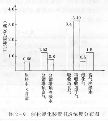 隨著重油催化裂化的發(fā)展,催化原料的含硫量越來越高,中石化系統(tǒng)最高達(dá)1.33%,再生煙氣中的S02、SO3濃度大幅度提高,另外H2S量也在成倍增長。統(tǒng)計某重油催化裂化裝置U2S濃度分布如圖2—9。