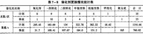 我國大型合成氨裝置投產(chǎn)初期,催化劑發(fā)生損壞的事故也較多。1977年到1980年四年期間,13套大型合成氨裝置八種催化劑中七種催化劑更換了58次。其中,因事故更換23次共760.02t,按計劃更換35次共1316.66t,事故更換催化劑占總更換量的36.6%。整爐更換共46爐。其中,事故更換13爐,計劃更換33爐。事故更換次數(shù)最多的是一段轉(zhuǎn)化催化劑。詳見表7—8(1) 。