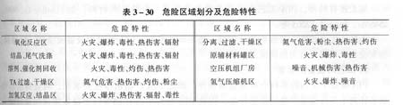 由于多種危險(xiǎn)物質(zhì)存在于整個(gè)工藝過(guò)程中,按照中石化及國(guó)家有關(guān)文件及法規(guī),該裝置主要危險(xiǎn)區(qū)域有:氧化反應(yīng)器、空壓機(jī)、加氫反應(yīng)器、氧化干燥機(jī)等系統(tǒng)如表3—31所示。