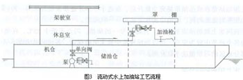 泵送式水上加油站如圖3,它是由儲油倉、加油泵、管線、止回閥、閘閥、過濾器、流量計、球閥、耐油膠管、加油槍組成。這種形式的水上加油站除船體和自身動力等要符合使用要求外,還應(yīng)注意的主要問題是選泵要準(zhǔn)確,即流量、流速和電機(jī)功率不能過大,安裝要滿足使用要求和便于操作。