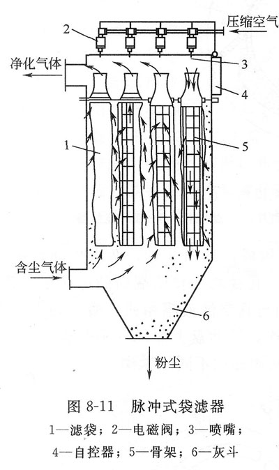 袋濾器的形式有多種,含塵氣體可以由濾袋內(nèi)向外過濾,也可以由外向內(nèi)過濾。圖8—11為某種形式袋濾器的結(jié)構(gòu)示意圖。含塵氣體由下部進入袋濾器,氣體由外向內(nèi)穿過支撐于骨架上的濾袋,潔凈氣體匯集于上部由出口管排出,塵粒被截留于濾袋外表面。清灰操作時,開啟壓縮空氣以反吹系統(tǒng),使塵粒落入灰斗。