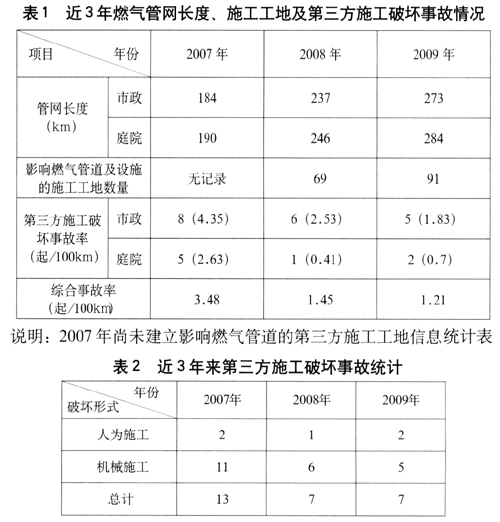 ???2007年、2008年及2009年3年來的第三方施工工地和破壞事故情況調(diào)查如表1、表2。