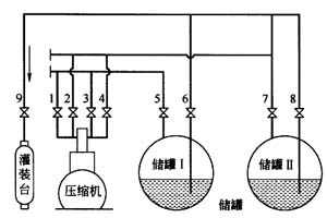 利用壓縮機(jī)升壓輸送氣體的性能,提高液化石油氣儲(chǔ)罐內(nèi)壓力,使液態(tài)液化石油氣流入空瓶?jī)?nèi)。