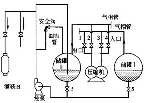 當利用儲罐Ⅰ中的液化石油氣灌瓶時,打開閥門1、4和6,關閉閥門2、3和5。壓縮機將儲罐Ⅱ的氣態(tài)液化石油氣打入儲罐Ⅰ,儲罐Ⅰ中的液態(tài)液化石油氣經閥門6進入烴泵升壓,再進灌裝臺進行灌瓶作業(yè)。
