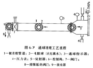 用通球方法清理管道,清球器是用橡膠制作的具有強性的空心球,中間灌滿水。這樣橡膠球有一定重力,在0.3 MPa壓力作用下產(chǎn)生前進動力,同時又保持不變形。橡膠球的直徑根據(jù)管子直徑選擇,一般為過盈配合,比管徑略大一些。φ325管徑,選擇φ350橡膠球;φ273管徑選擇φ300橡膠球;φ159管徑選擇φ170橡膠球。橡膠球在壓力作用下向前運行,與管壁產(chǎn)生摩擦將浮銹、鐵屑、焊渣、砂土等雜物帶礎,最后橡膠球回到接收器內。