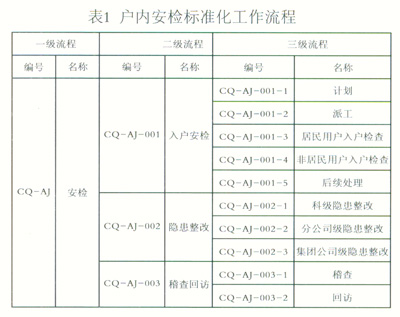 戶內(nèi)安檢標(biāo)準(zhǔn)化工作流程(見(jiàn)表1)由1個(gè)一級(jí)流程、3個(gè)二級(jí)流程、10個(gè)三級(jí)流程構(gòu)成,形成控制嚴(yán)謹(jǐn)?shù)牧鞒桃?guī)范。其中,一級(jí)流程為安檢工種,二級(jí)流程為安全檢查、隱患整改和稽查回訪,三級(jí)流程包括計(jì)劃、派工、后續(xù)處理等。導(dǎo)則還對(duì)每一級(jí)流程的具體工作標(biāo)準(zhǔn)進(jìn)行了規(guī)范。