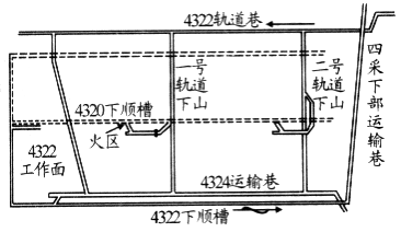 興隆莊煤礦位于兗州煤田北部、井田面積54km2,煤系地層屬石炭二疊紀(jì),穩(wěn)定可采煤層共5層?,F(xiàn)開有3#煤層,平均厚度8.65m。全礦共3個(gè)采區(qū),設(shè)計(jì)生產(chǎn)能力300萬(wàn)t/a。4322-聯(lián)巷道冒頂比較嚴(yán)重,掘進(jìn)時(shí)與4320下順槽(采空區(qū))溝通,在4322-聯(lián)掘進(jìn)頭打木垛處冒出濃煙,不久發(fā)現(xiàn)明火,用水直接滅火未能將火區(qū)熄滅,隨即撤人并對(duì)火區(qū)進(jìn)行了封閉,火區(qū)封閉巷道120余米,巷道布置如圖1所示。