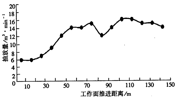 2622(3)工作面開始回采第3日即開始抽放,在40m處(老頂未冒落之前)抽放濃度為15%~20%,抽放流量為6~9 m3/min,抽放率為40%,工作面回風(fēng)流的瓦斯?jié)舛葹?.5%~0.6%;當(dāng)工作面推進(jìn)超過高抽巷40m(即老頂冒落后),高抽巷抽放量明顯增加,抽放濃度為30%~50%,抽放流量為12~16 m3/min,抽放率在50%以上,工作面回風(fēng)流的瓦斯?jié)舛葹?.5%~0.7%,有效地解決了工作面初采及正?;夭善陂g的瓦斯問題。高抽蒼的抽放量隨推進(jìn)距離的變化曲線如圖2所示。