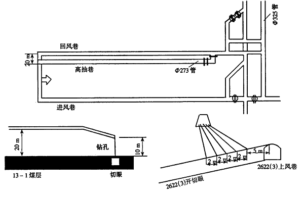 即在煤層頂板布置高抽巷,嚴(yán)格控制巷道層位并調(diào)整其傾角,并在開切眼向高抽巷打大直徑鉆孔,人為地將二者進(jìn)行溝通,利用高抽巷在初次來(lái)壓前就可抽放采空區(qū)瓦斯。
