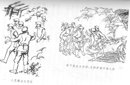 最先發(fā)現(xiàn)火災(zāi)的人員,盡可能進(jìn)行直接滅火,并立即向礦調(diào)度室報(bào)告,說明發(fā)火地點(diǎn)、性質(zhì)(膠帶輸送機(jī)著火?電纜著火?木支架著火?……)、影響范圍等情況;調(diào)度室要立即通知礦領(lǐng)導(dǎo)等有關(guān)人員,立即向上級匯報(bào),立即召請救護(hù)隊(duì),立即 停止災(zāi)區(qū)供電和撤出災(zāi)區(qū)人員灰區(qū)人員要迎著新風(fēng)撤退,或盡快進(jìn)入新鮮風(fēng)流撤退;若通路被阻時應(yīng)盡快構(gòu)筑臨時避難硐室待救。