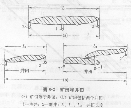 劃歸一個礦山企業(yè)開采的全部礦床或某一部分叫礦田。在一個礦山企業(yè)中劃歸一個礦井(坑口)開采的全部礦床或其中一部分叫井田,如圖5—2所示。礦田有時等于井田,有時包括數(shù)個井田。