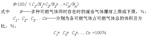 混合氣體中有兩種以上可燃?xì)怏w同時(shí)存在時(shí),其爆炸界限決定于各可燃?xì)怏w的爆炸界限和它們的濃度??捎晒角蟪觯?br />