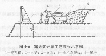 露天礦開采由剝巖、采礦和掘溝三個環(huán)節(jié)組成,其主要生產(chǎn)工藝程序:穿孔、爆破、礦(巖)的鏟裝、礦巖的運輸及巖石的排卸。露天開采工藝流程如圖4-6所示。