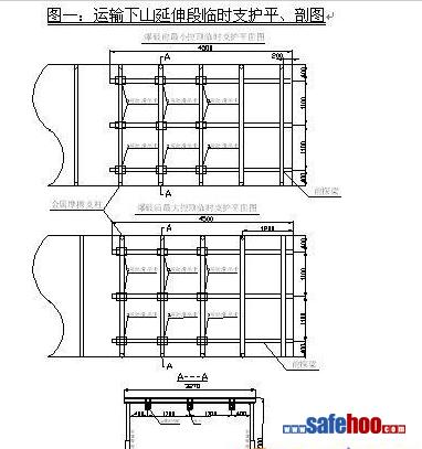 1、運(yùn)輸下山延伸段臨時(shí)支護(hù)平、剖面,如圖一所示(單位:mm)
