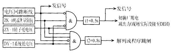 解列動(dòng)作于跳發(fā)電機(jī)出口開關(guān);程序跳閘動(dòng)作于主汽門關(guān)閉9 s后, 跳發(fā)電機(jī)主開關(guān)、滅磁開關(guān)、6 kV各分支開關(guān)。