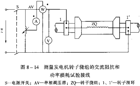 ①試驗(yàn)接線:測(cè)量發(fā)電機(jī)轉(zhuǎn)子繞組的交流阻抗和功率損耗試驗(yàn)接線如圖8—14所示。圖中儀表的量限應(yīng)按具體機(jī)組而定,準(zhǔn)確度不得低于0.5級(jí)。