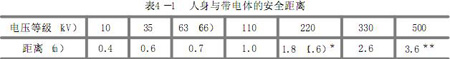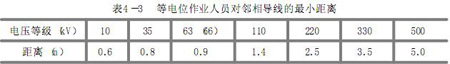 (2)等電位作業(yè)人員對(duì)地距離不應(yīng)小于表4-1的規(guī)定,對(duì)鄰相導(dǎo)線的距離不小于表4-3的規(guī)定。