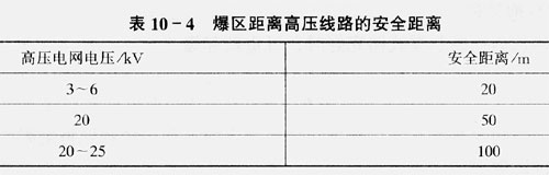 高壓電在其輸電線路、變壓器和電器開關(guān)的附近,存在著一定強(qiáng)度的電磁場,如果在高壓線路附近實施電爆,就可能在起爆網(wǎng)路中產(chǎn)生感應(yīng)電流,當(dāng)感應(yīng)電流超過一定數(shù)值后,就可引起電雷管爆炸,造成早爆事故。爆區(qū)距離高壓線路的最小安全距離如表10-4所示。