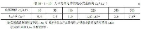 最小相間安全距離LSP通常比最小安全作業(yè)距離LSW要小一個(gè)作擁人員活動(dòng)范圍安全距離值,即LSW=LSP+LA(LA為人體作業(yè)時(shí)的活動(dòng)范圍)。LSP與LSW規(guī)定最小距離分別見表10-1-11和表10-1-12