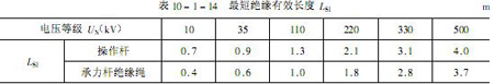(3)最短絕緣有效長度LS1。當(dāng)帶電作業(yè)人員使用絕緣操作桿進(jìn)行作業(yè)時(shí),帶電體可能會(huì)沿著絕緣操作桿表面對(duì)處于其側(cè)面的接地作業(yè)人員放電閃絡(luò)。因此,為確保作業(yè)人員的人身安全,從作業(yè)人員手握處至帶電體之間需要保持一個(gè)最短的絕緣桿有效長度(扣除絕緣桿中間金屬連接接頭長度后的絕緣長度)。由試驗(yàn)可知,在相同的間距下,絕緣體表面的閃絡(luò)電壓總是低于空氣間隙的擊穿電壓。在相同電壓作用條件下,LSI>LSD最短絕緣有效長度見表10-1-14所列數(shù)據(jù)。