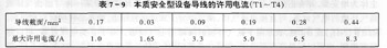 本質安全型設備導線的許用電流可參考表7—9所列數(shù)據(jù)。除特殊情況外,該型設備及其關聯(lián)設備外殼防護等級不得低于IP20,煤礦井下采掘工作面的不得低于IP54。其外部連接可以采用接線端子與接線盒或采用插接件,接線端子之間、接線端子與外殼之間均應有足夠的距離,插接件應有防止拉脫的措施。