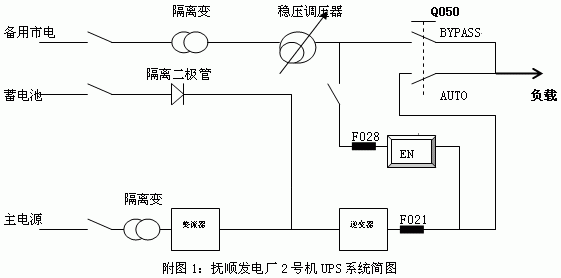 撫順發(fā)電廠2號(hào)機(jī)為2002年6月投產(chǎn)的200MW采暖、凝汽兩用式汽輪發(fā)電機(jī)組。其單元220V不間斷電源系統(tǒng)選用由美國(guó)GUTOR公司生產(chǎn),青島整流器廠經(jīng)銷的PEW1000型UPS系統(tǒng);該系統(tǒng)只供重要的調(diào)節(jié)、控制、保護(hù)儀表監(jiān)測(cè)和重要信號(hào)電源,不做一般負(fù)荷電源。