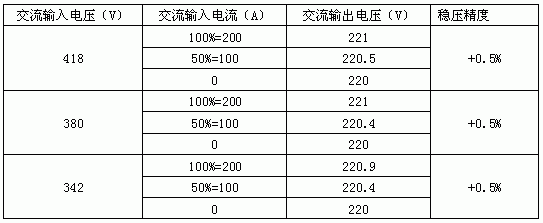 第三,由穩(wěn)壓調(diào)壓器穩(wěn)壓精度與投產(chǎn)前試驗(yàn)數(shù)據(jù)(如下表)比較結(jié)果證明穩(wěn)壓調(diào)壓器工作失穩(wěn),導(dǎo)致電壓波動不穩(wěn)定使靜態(tài)開關(guān)自動關(guān)斷;所以穩(wěn)壓調(diào)壓器需嚴(yán)格檢修、檢查。