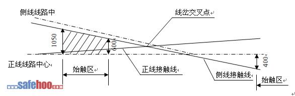 、始觸區(qū):即正線接觸線水平投影距側(cè)線線路中心;側(cè)線接觸線水平投影距正線線路中心線550~1050mm。