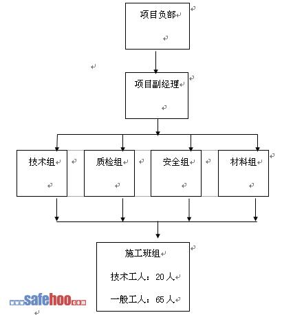 為確保優(yōu)質(zhì)、高速、安全、文明地完成本工程建設(shè)任務(wù),項目經(jīng)理部本著科學(xué)管理、精干高效、結(jié)構(gòu)合理的原則,選配具有改革開拓精神、施工經(jīng)驗豐富、服務(wù)態(tài)度良好、勤奮實干的工程技術(shù)和管理人員。項目經(jīng)理部設(shè)項目經(jīng)理一名、技術(shù)負責(zé)人一名、項目主管生產(chǎn)副經(jīng)理一名組成項目領(lǐng)導(dǎo)層。下設(shè)"四部一室",即施工部、技術(shù)部、質(zhì)安部、物資部、辦公室,組成項目管理層