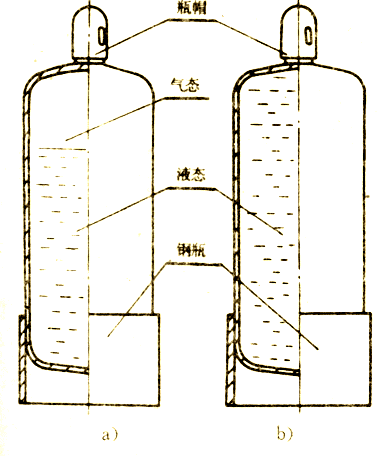 (3) 熱處理車間常用的氨氣和丙烷氣在灌裝時,應(yīng)注意它們的“充裝系數(shù)”。充裝系數(shù)是單位容積的允許充裝氣體最大的重量。如氨氣的充裝系數(shù)為0.53kg/L;丙烷為0.41kg/L。鋼容器按照這個系數(shù)充裝好液化氣后,在容器下部是呈液態(tài)的液化氣,容器上部有一定空間是呈氣態(tài)的液化氣。如圖1a所示。這樣當(dāng)環(huán)境溫度升高,液態(tài)受膨脹時,使氣態(tài)受到壓縮(鋼容器內(nèi)壓力升高)。所以氣態(tài)的存在保證了可壓縮性。這時即使環(huán)境溫度升高達(dá)60℃時,對于丙烷鋼瓶的壓力約為21kg/cm<sup>2</sup>,對鋼質(zhì)容器來說這是安全使用范圍。如果在灌裝時不考慮充裝系數(shù),而是把液化氣裝滿鋼瓶為止。這樣瓶內(nèi)全部是呈液態(tài)的液化氣,而無氣態(tài)的液化氣空間。如圖1b所示。這時當(dāng)環(huán)境溫度升高,液態(tài)氣產(chǎn)生熱膨脹,但由于沒有氣態(tài)空間,液體本身又是不可壓縮的,膨脹時,呈液態(tài)的液化氣把鋼瓶一齊脹大,甚至脹破。曾經(jīng)有一個單位超過充裝系數(shù)裝丙烷氣,鋼瓶受熱后,液態(tài)丙烷氣膨脹把鋼瓶脹破,丙烷氣散出而造成火災(zāi)。