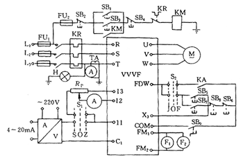 ????圖中VVVF是日產(chǎn)富士FRNO37P7-4EX57kVA通用變頻頻器,裝于低壓配電室內(nèi),其電源接觸器及運(yùn)轉(zhuǎn)命令上冷卻機(jī)現(xiàn)場(chǎng)和控制室兩地操作,KA?是篦冷機(jī)與破碎機(jī)聯(lián)鎖觸點(diǎn)。變頻器系統(tǒng)試車時(shí),因工藝需要,操作人員在主控室操作SB4斷開(kāi)變頻器電源接觸器KM,使處于集中控制的篦冷機(jī)停車。